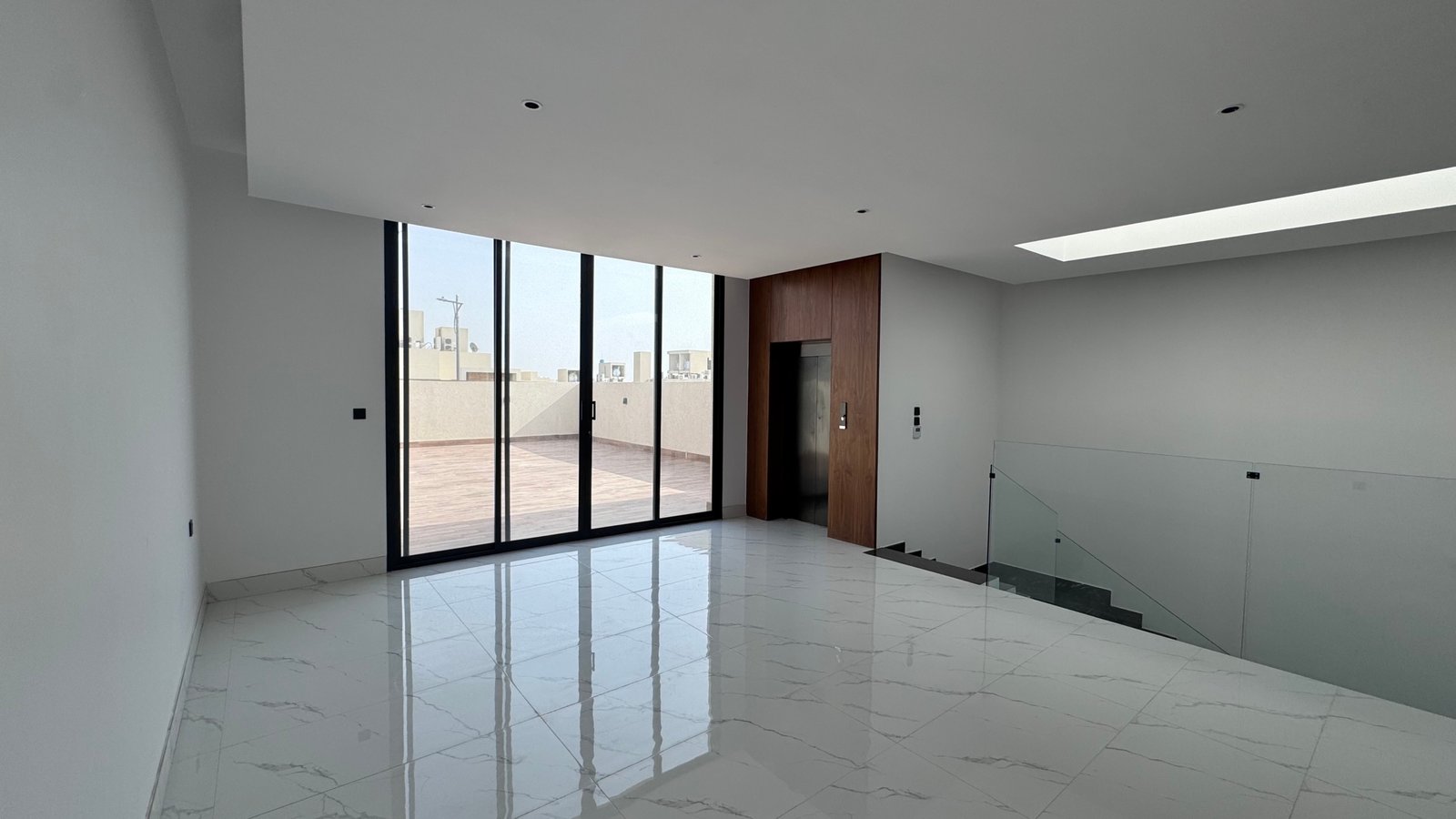 - الدور الثاني: صالة واسعة + سطح + غرفتين ماستر